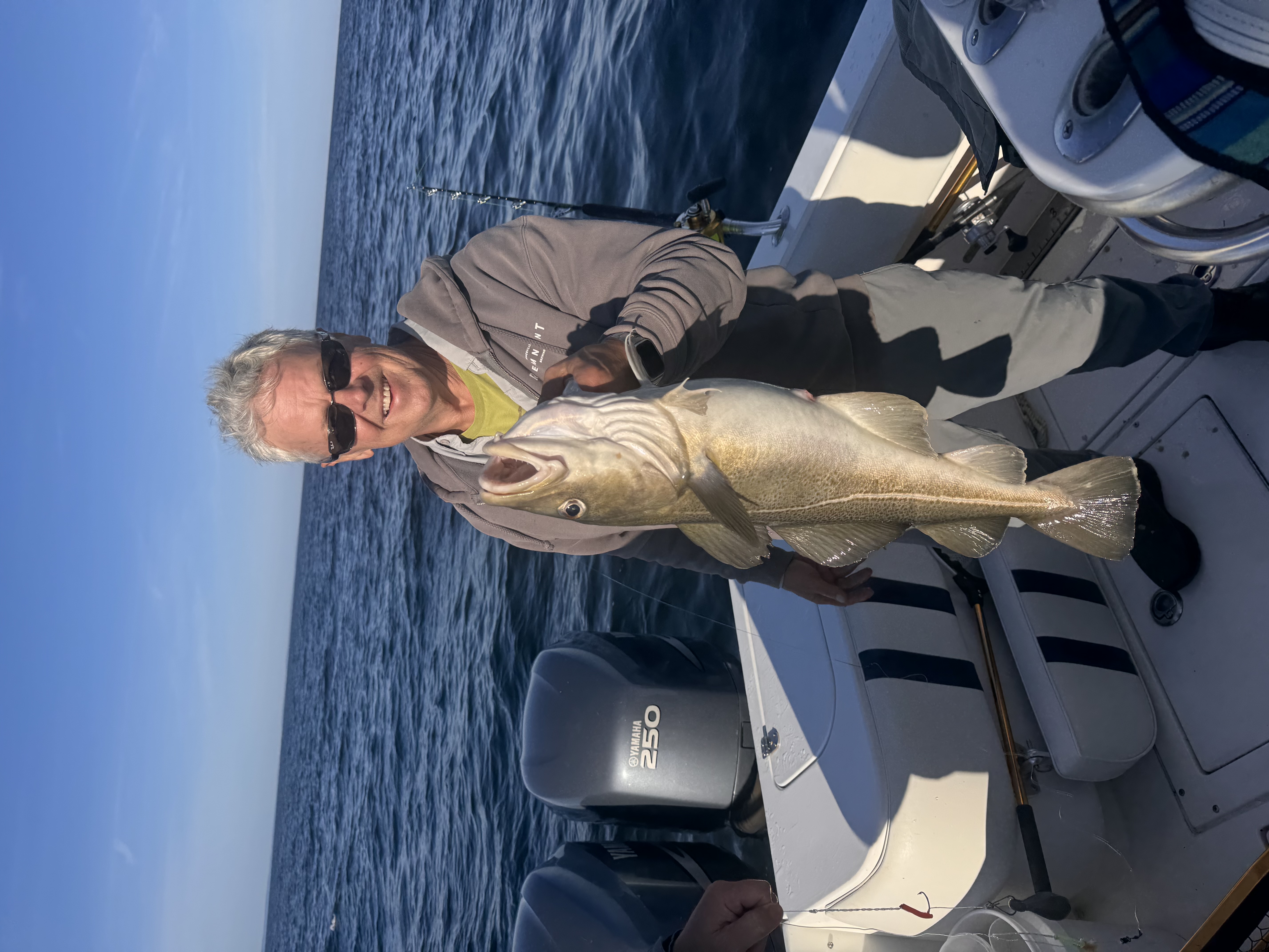 Quality cod such as this 34” as well as hot haddock fishing have par for the course for Legit Fish. Captain Mark Rowell of Legit Fish Charters is finding cod up to 34” and limits of haddock on most trips. That is arguably much better fishing than others are experiencing among more northern offshore structure, such as Jeffrey’s Ledge and Tillies. The key, according to the captain, is to find rocks/wrecks just to the side of soft bottom. Draggers tend to avoid the irregular bottom, which wreaks havoc on their gear, and instead pound muddy/gravely bottom. Clams, as well as pink cod flies/teasers, are doing the job. Ancillary wow moments continue aboard Legit Fish with a noteworthy one happening while the crew was trying to put a patron onto a blue shark. While setting out a chum slick, and as the blue sharks began to get close to the boat, an unforeseen mako exploded out of nowhere and slammed the bait. The takedown was ferocious and furious, but unfortunately, the fight short lived. Without a doubt, that angler will be booking another trip soon. "on the water"